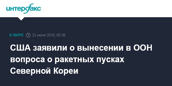 Москва. 22 июня. INTERFAX.RU - Соединенные Штаты планируют инициировать в СБ ООН рассмотрение вопрос о пусках КНДР баллистических ракет среднего радиуса действия, сообщил официальный представитель американского госдепартамента Джон Кирби.