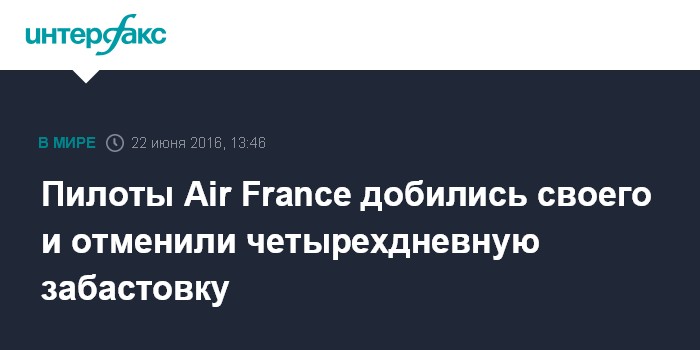 Москва. 22 июня. INTERFAX.RU - Пилоты авиакомпании Air France решили не проводить четырехдневную забастовку после того, как руководство компании отозвало план по сокращению зарплат, сообщает MarketWatch.