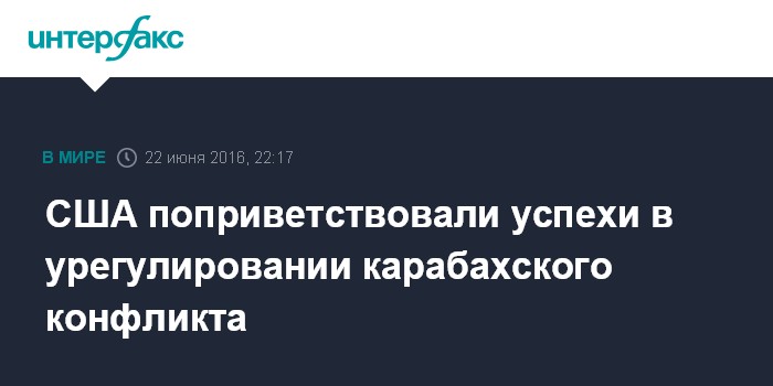 Москва. 22 июня. INTERFAX.RU - Вашингтон отмечает успехи в процессе урегулирования карабахского конфликта после встречи президентов России, Азербайджана и Армении в Санкт-Петербурге, заявил посол США в Баку Роберт Секута.