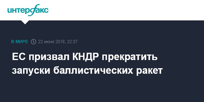 Москва. 22 июня. INTERFAX.RU - Осуществленные Северной Кореей очередные запуски ракет с использованием баллистической технологии являются явным нарушением международных обязательств по нескольким резолюциям СБ ООН, включая последнюю от 2 марта, заявил официальный представитель Европейской внешнеполитической службы.