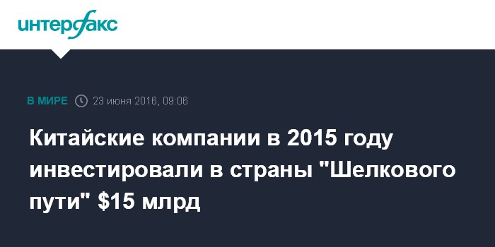 Москва. 23 июня. INTERFAX.RU - В ходе реализации программы возрождения "Великого шелкового пути" в 2015 году китайские компании инвестировали $15 млрд в страны, расположенные по этому маршруту, сообщил председатель КНР Си Цзиньпин.