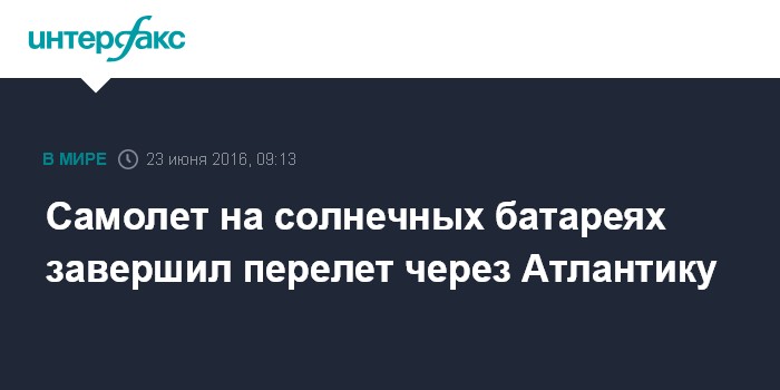 Москва. 23 июня. INTERFAX.RU - Экспериментальный самолет на солнечных батареях Solar Impulse 2 (SI2) в рамках кругосветного путешествия успешно завершил в четверг перелет через Атлантический океан и приземлился в Севилье (Испания), сообщили организаторы проекта.