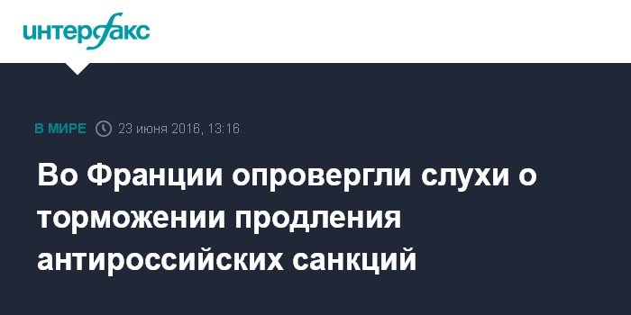 "Нет никакого торможения Францией принятия этого решения, это все лишь домыслы и игра на спекуляциях. Ознакомьтесь с соответствующим заявлением французского министра иностранных дел Жан-Марка Эро. Он был предельно ясен в своем высказывании. Речь идет о том, чтобы в дальнейшем, в ближайшие месяцы состоялись предметные дебаты о ходе выполнения минских соглашений, выводы из которых послужили бы принятию новых решений о санкциях", - пояснил собеседник агентства.