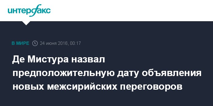 Москва. 24 июня. INTERFAX.RU - После 29 июня, возможно, будет объявлена дата следующего раунда межсирийских переговоров, сообщил Специальный посланник ООН по Сирии Стаффан де Мистура