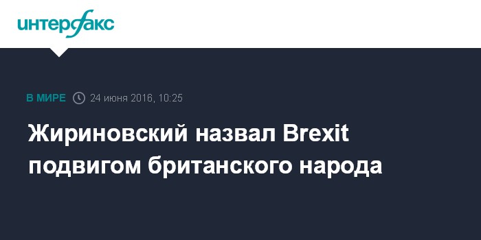 Москва. 24 июня. INTERFAX.RU - Лидер ЛДПР Владимир Жириновский полагает, что народ Британии совершил великий подвиг, приняв решение о выходе из Евросоюза, и намерен направить поздравительную телеграмму премьер-министру этой страны Дэвиду Кэмерону.
