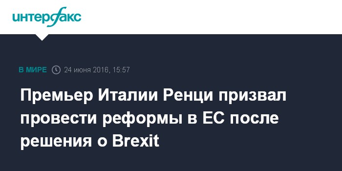 Москва. 24 июня. INTERFAX.RU - Премьер-министр Италии Маттео Ренци заявил в пятницу, что уважает решение британцев покинуть ЕС и призвал провести реформы в этом интеграционном объединении.
