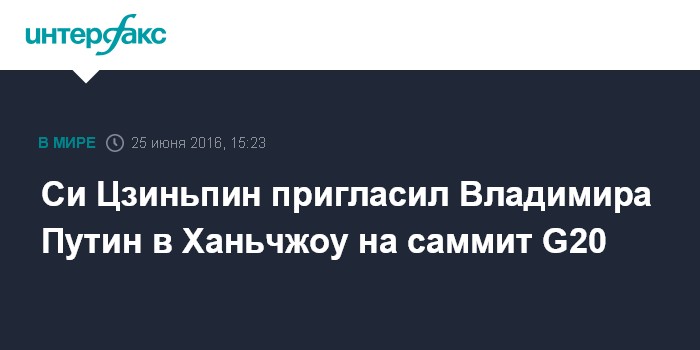 Москва. 25 июня. INTERFAX.RU - Председатель КНР Си Цзиньпин пригласил президента РФ Владимира Путина на саммит "группы двадцати" в китайском Ханьчжоу.