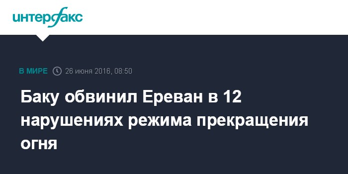 Москва. 26 июня. INTERFAX.RU - Вооруженные силы Армении нарушили за минувшие сутки режим прекращения огня на линии соприкосновения азербайджанских и армянских вооруженных сил 12 раз, сообщает пресс-служба Министерства обороны Азербайджана.