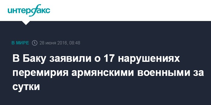 Москва. 28 июня. INTERFAX.RU - Армянские военные нарушили за минувшие сутки режим прекращения огня на линии соприкосновения вооруженных сил 17 раз, утверждают во вторник в пресс-службе Министерства обороны Азербайджана.
