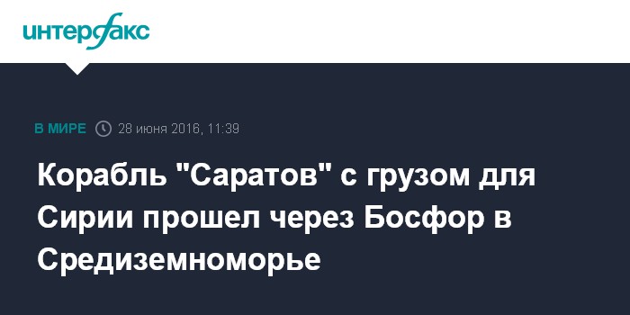 Москва. 28 июня. INTERFAX.RU - Большой десантный корабль Черноморского флота "Саратов", идущий с грузом в Сирию, проследовал через черноморские проливы в акваторию Средиземного моря - фотографии его прохождения в понедельник вечером через Босфор опубликованы на местных ресурсах.