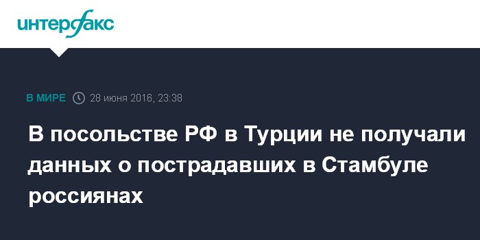Москва. 28 июня. INTERFAX.RU - Российские дипломаты в Турции пока не располагают данными о том, пострадали ли россияне в результате двойного теракта в аэропорту Стамбула.