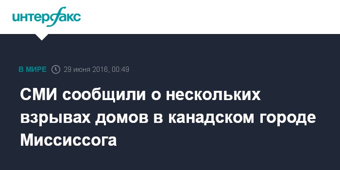 Москва. 29 июня. INTERFAX.RU - В нескольких жилых домха канадского города Миссиссога произошли взрывы, передает CTV со ссылкой на сообщения экстренных служб. Жители окрестных домов эвакуированы.