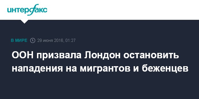 Москва. 29 июня. INTERFAX.RU - ООН призывает властей Великобритании остановить ксенофобию в отношении мигрантов и беженцев и решительно осуждает недавние нападения в стране на иностранцев и группы меньшинств.