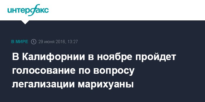 Москва. 29 июня. INTERFAX.RU - Вопрос о легализации марихуаны в штате Калифорния будет вынесен на голосование в ноябре, сообщают западные СМИ со ссылкой на местные власти.