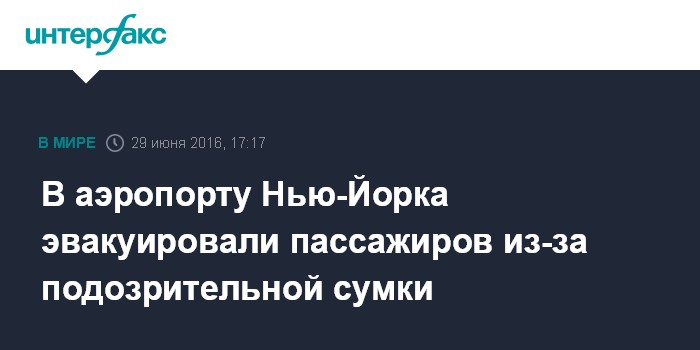 Москва. 29 июня. INTERFAX.RU - Сотрудники полиции в среду эвакуировали часть пассажиров из одного из терминалов нью-йоркского аэропорта имени Джона Кеннеди в связи с обнаружением подозрительной бесхозной сумки, сообщает телеканал CBS.