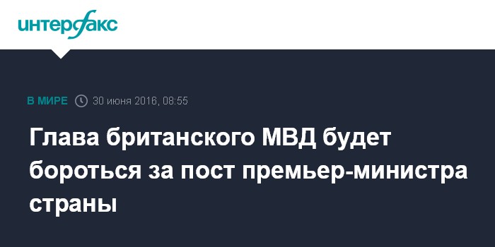 Москва. 30 июня. INTERFAX.RU - Министр внутренних дел Великобритании Тереза Мэй объявила о намерении бороться за пост главы Консервативной партии и премьер-министра страны, сообщает The Daily Mail.