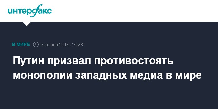 Москва. 30 июня. INTERFAX.RU - Президент РФ Владимир Путин считает необходимым противодействовать информационной монополии на международной арене.