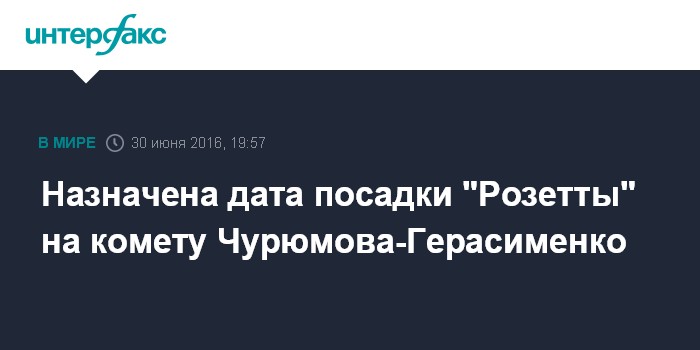 Москва. 30 июня. INTERFAX.RU - Европейское космическое агентство назвало дату окончания миссии "Розетты" — 30 сентября 2016 года, сообщает сайт N+1. Аппарат постепенно снизится относительно кометы, после чего произойдет контролируемое столкновение с поверхностью. Скорость сближения ожидается в два раза меньшей, чем во время посадки зонда "Филы", однако сразу после посадки связь с "Розеттой" прекратится. Детали завершения миссии еще обсуждаются.