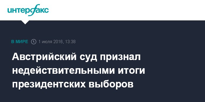 Москва. 1 июля. INTERFAX.RU - Конституционный суд Австрии признал недействительными итоги президентских выборов ввиду многочисленных нарушений и вынес постановление о проведении новых выборов, сообщила в пятницу немецкая газета Frankfurter Allgemeine Zeitung.