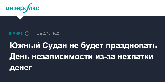 Москва. 1 июля. INTERFAX.RU - Власти Южного Судана, самого молодого государства на планете, заявили, что не станут отмечать в этом году День независимости ввиду отсутствия средств, сообщила в пятницу британская газета The Independent.