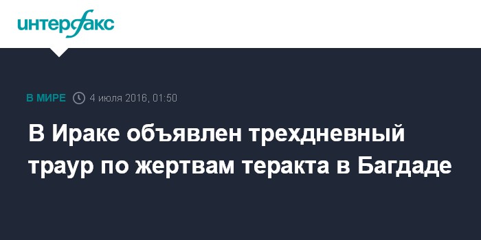 Москва. 4 июля. INTERFAX.RU - Иракское правительство объявило трехдневный национальный траур после взрыва бомбы в Багдаде, в результате которого погибли по меньшей мере 125 человек и получили ранения около 150, передает BBC.