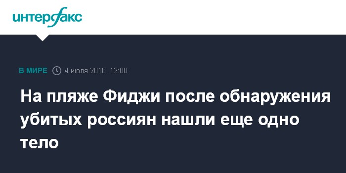Москва. 4 июля. INTERFAX.RU - Полиция Фиджи обнаружила останки еще одного человека на пляже Натадола, куда ранее вынесло тела убитой семейной пары россиян, сообщают в понедельник местные СМИ.