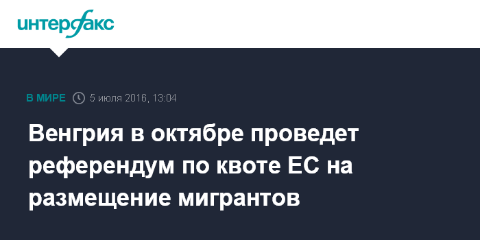 Москва. 5 июля. INTERFAX.RU - Референдум, в ходе которого граждане Венгрии скажут, поддерживают ли они введенные ЕС обязательные квоты на размещение в их стране беженцев, состоится 2 октября.
