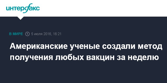 Москва. 5 июля. INTERFAX.RU - Американские исследователи описали новый подход к созданию вакцин. Используя РНК патогена и наночастицы, препарат против новой инфекции можно получить за неделю — и подготовить иммунитет ко встрече с болезнью, сообщает сайт N+1 со ссылкой на журнал Proceedings of the National Academy of Sciences.