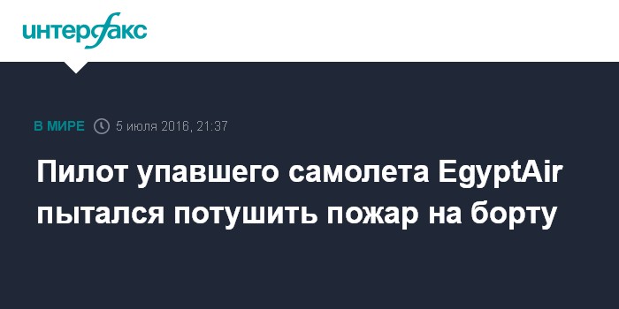 Москва. 5 июля. INTERFAX.RU - Информация бортового самописца потерпевшего катастрофу в Средиземном море пассажирского самолета EgyptAir указывает на то, что один из пилотов пытался потушить пожар на борту авиалайнера до падения в Средиземное море, приводит во вторник телеканал "Аль-Арабийя" данные комиссии, ведущей расследование.
