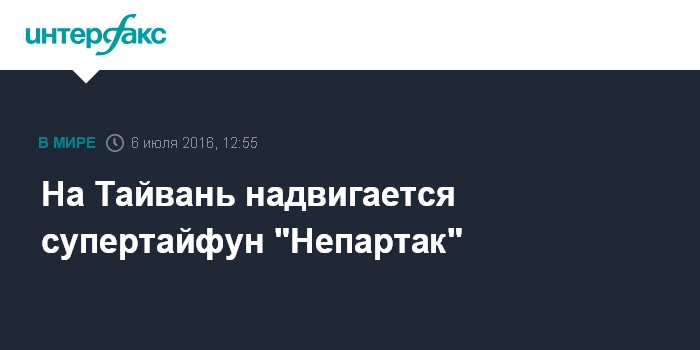 Москва. 6 июля. INTERFAX.RU - Власти острова Тайвань предупредили местное население о необходимости быть готовым к скорому приходу супертайфуна "Непартак" - первому тайфуну за этот сезон, сообщают в среду западные СМИ.