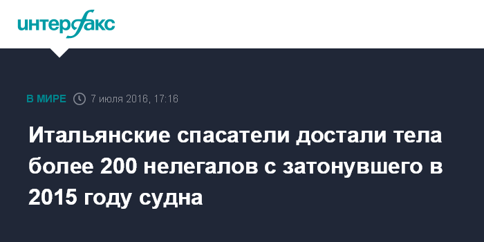 Москва. 7 июля. INTERFAX.RU - Итальянские спасатели к настоящему моменту извлекли из обломков судна, потерпевшего крушение в апреле 2015 года в Средиземном море, трупы 217 нелегалов, говорится в заявлении ВМС Италии, обнародованном в четверг.