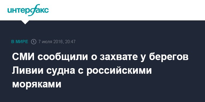 Москва. 7 июля. INTERFAX.RU - Греческое судно с тремя российскими моряками на борту было захвачено у берегов Ливии, сообщает телеканал "Звезда".