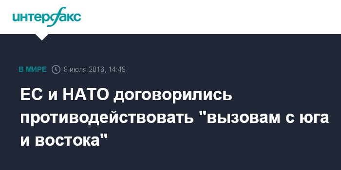 Москва. 8 июля. INTERFAX.RU - ЕС и НАТО на полях саммита альянса в Варшаве подписали декларацию об активизации сотрудничества по обеспечению безопасности в Европе и совместном противодействии вызовам, "исходящим с юга и востока".