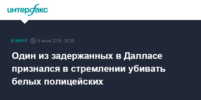 Москва. 8 июля. INTERFAX.RU - Один из задержанных в Далласе (США) после стрельбы по полицейским заявил на допросе, что стремился убивать белых стражей порядка, сообщил шеф городской полиции Дэвид Браун.