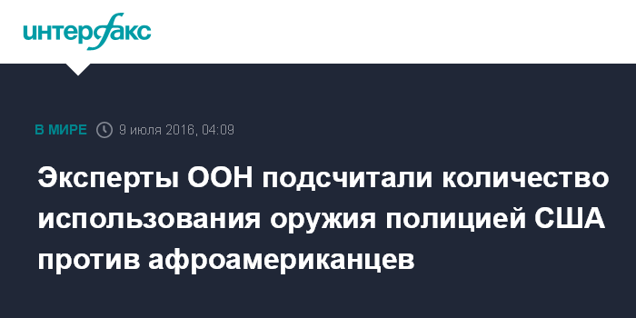 Москва. 9 июля. INTERFAX.RU - Американские полицейские в ходе рейдов и обеспечения правопорядка в два раза чаще применяют оружие против афроамериканцев, чем против белых людей, говорится в заявлении членов Рабочей группы ООН по проблеме лиц африканского происхождения.