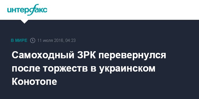 Москва. 11 июля. INTERFAX.RU - Самоходный зенитно-ракетный комплекс (ЗРК) перевернулся в воскресенье в городе Конотопе Сумской области Украины, в результате никто не пострадал, сообщает пресс-служба украинского оперативного командования "Север".