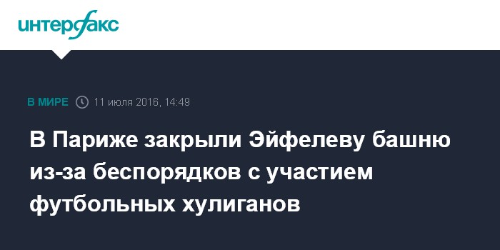 Москва. 11 июля. INTERFAX.RU - Оператор Эйфелевой башни в Париже принял решение закрыть в понедельник доступ публики к ней в связи с беспорядками во время финального матча на Чемпионате Европы по футболу, в котором французская сборная потерпела поражение от Португалии, сообщает агентство The Associated Press.