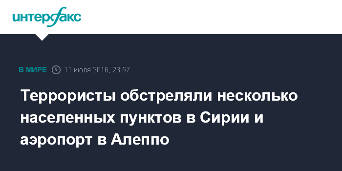 Москва. 11 июля. INTERFAX.RU - Боевики ИГ и Джабхат-ан-Нусры (организации запрещены в РФ) за сутки обстреляли несколько населенных пунктов в провинциях Алеппо, Дамаск и Латакия, а также аэропорт города Алеппо, сообщили в понедельник в Минобороны РФ.