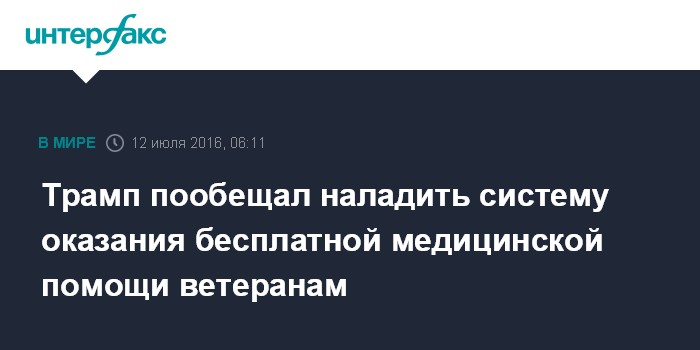 В интервью Трамп сказал, что "эти люди умирают потому, что они не имеют возможности даже показаться врачу". "Таким образом, (за счет плана - ИФ) мы покончим с этим. Больше никогда мы не позволим, чтобы ветеран страдал или даже умирал в ожидании медпомощи, которую он всецело заслужил", - отметил кандидат в президенты.