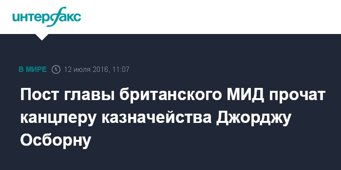 Москва. 12 июля. INTERFAX.RU - Министром иностранных дел в правительстве нового британского премьера Терезы Мэй может стать Джордж Осборн, который доныне занимал пост канцлера казначейства, в то время как этот пост может занять бывший глава британского МИД Филип Хаммонд, пишет во вторник британская газета Daily Mail.
