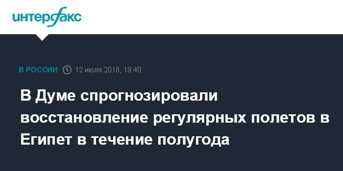 Москва. 12 июля. INTERFAX.RU - В течение ближайшего полугода может быть восстановлено регулярное авиасообщение с Египтом, заявил глава думского комитета по собственности Сергей Гаврилов по итогам переговоров с председателем парламента Египта Али Абдель Алем.