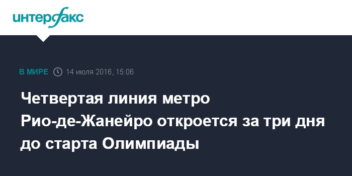 Москва. 14 июля. INTERFAX.RU - Линия метро, которая соединит олимпийский кластер Барра с центром Рио-де-Жанейро, откроется за три дня до старта летней Олимпиады 2016 года, заявила председатель Координационной комиссии Международного олимпийского комитета (МОК) Наваль Эль-Мутавакель.