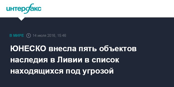 Москва. 14 июля. INTERFAX.RU - Комитет всемирного наследия ЮНЕСКО на проходящей в Стамбуле 40-й сессии внес пять объектов Всемирного наследия в Ливии в число находящихся под угрозой, говорится в сообщении, опубликованном в четверг на сайте организации.