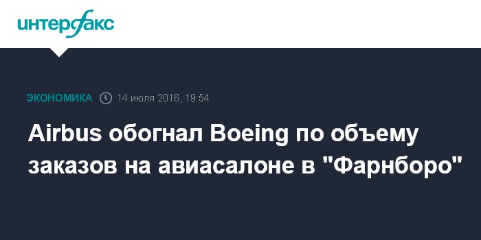 Москва. 14 июля. INTERFAX.RU - Airbus Group SE получила заказы на общую сумму $35 млрд в рамках международного авиасалона в британском Фарнборо, обогнав конкурента Boeing Inc с $26,8 млрд, сообщает MarketWatch.
