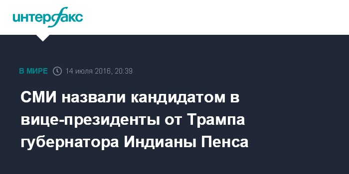 Москва. 14 июля. INTERFAX.RU - Участник президентской гонки в США Дональд Трамп, вероятно, предложит баллотироваться в вице-президенты губернатору штата Индиана Майку Пенсу, пишет в четверг американская пресса.