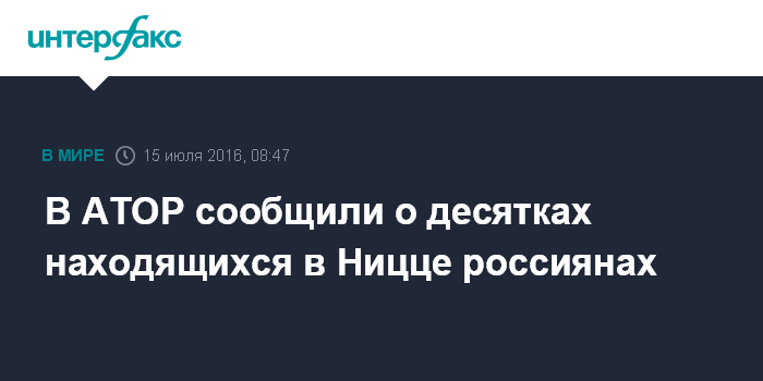 Москва. 15 июля. INTERFAX.RU - Ассоциация туроператоров России (АТОР) сообщила о десятках россиян, находящихся в данный момент в Ницце, где накануне произошел теракт.