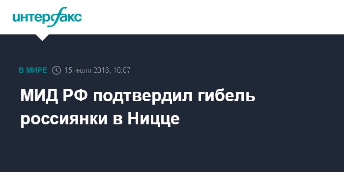 Москва. 15 июля. INTERFAX.RU - В МИД РФ подтвердили гибель россиянки и ранение еще одной гражданки России в результате террористической атаки в Ницце.