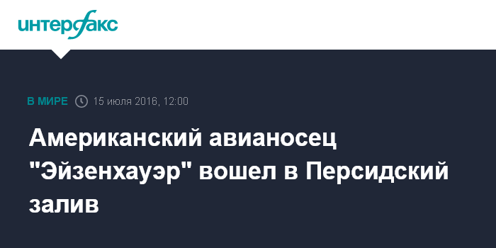 Москва. 15 июля. INTERFAX.RU - Американская авианосная ударная группа во главе с атомным авианосцем "Эйзенхауэр" вошла в акваторию Персидского залива, сообщили СМИ ОАЭ.