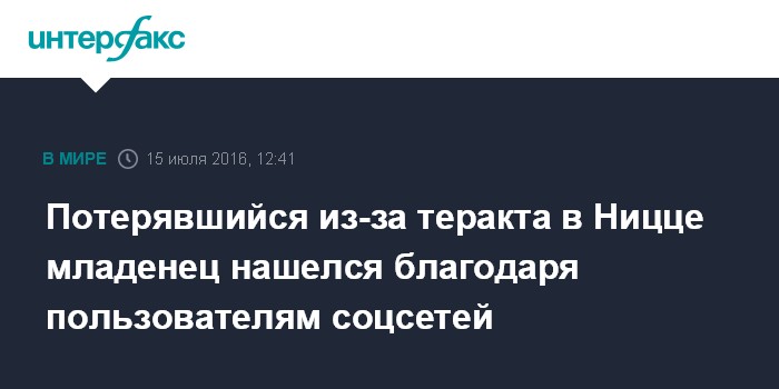 Москва. 15 июля. INTERFAX.RU - Восьмимесячного ребенка, потерявшегося накануне в результате теракта на Английской набережной в Ницце, удалось найти благодаря солидарности пользователей фейсбука.