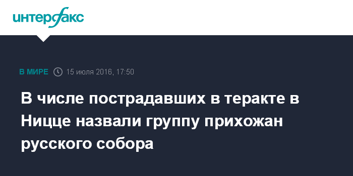 Москва. 15 июля. INTERFAX.RU - В результате теракта в Ницце пострадали прихожане местного русского Свято-Николаевского собора, написала на своей странице в фейсбуке православная журналистка Алена Малер.